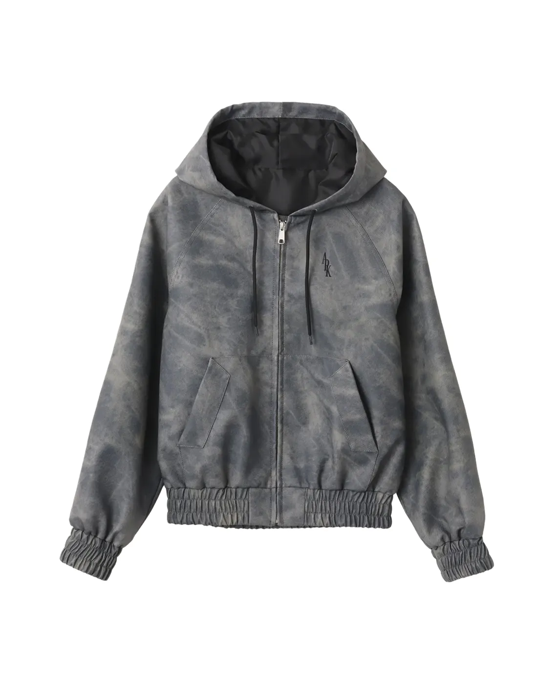ACIDウォッシュ加工を施したテーラード型のジャージークロップドジャケットに、同素材のカーブスウェットパンツとローズカモジップフーディを合わせた、