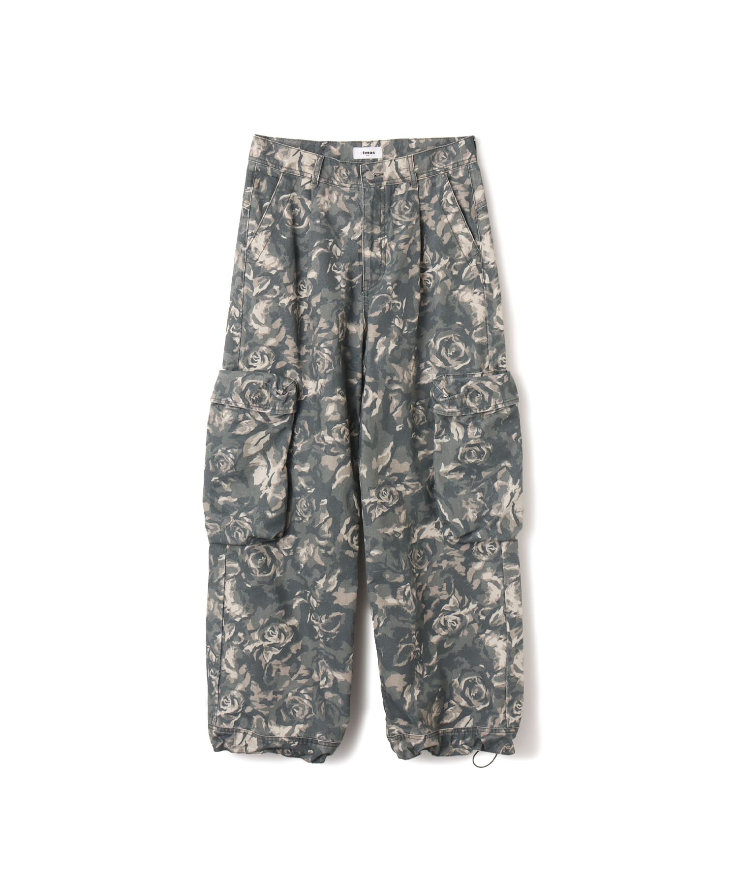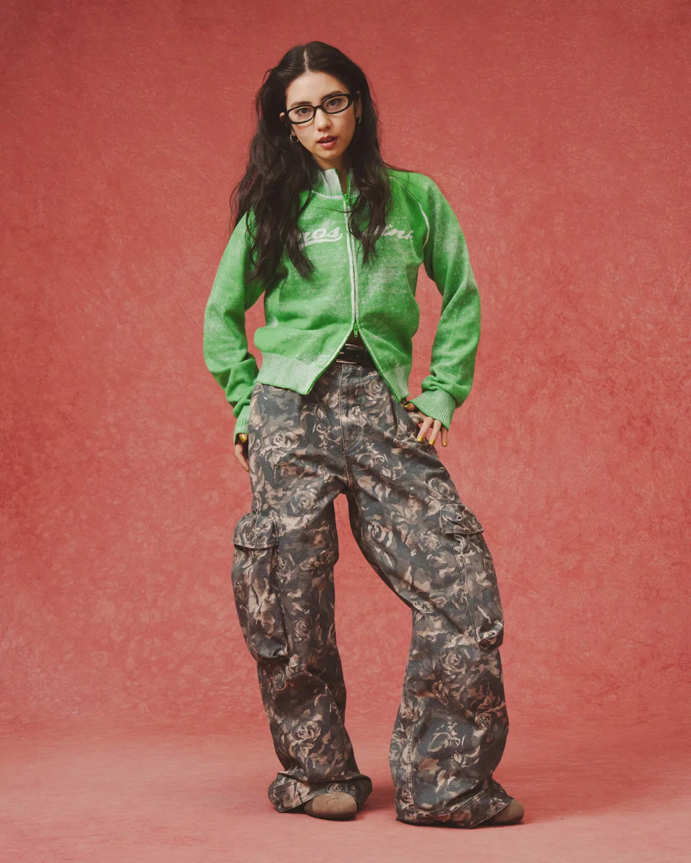 フェード感のあるジップロゴカーディガンに、インパクトのあるオリジナルローズカモ柄カーゴパンツをコーディネートした、ストリート感あるスタイリング。